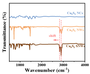 Trong phổ FT-IR của Cu9S5 SNW như trên Hình 3, quan sát thấy hiện tượng dịch chuyển đỏ đáng kể so với Cu9S5 NW, cho thấy sự tương tác điện tử giữa Cu và S. Các đỉnh đặc trưng của các mẫu Cu9S5 NW và Cu9S5 SNW ở 2916 cm-1 và 2846 cm-1 có thể được quy cho chế độ rung kéo dài của methylene (- CH2-) trong dodecanethiol, trong khi đỉnh đặc trưng ở 1471 cm-1 tương ứng với mode dao động uốn của liên kết C-H.