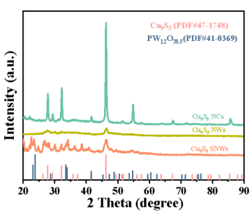 Chiều rộng nửa đỉnh của mặt phẳng tinh thể Cu9S5 SNWs (001) lớn hơn đáng kể so với hai dạng mẫu còn lại. Theo công thức Scherrer, kích thước hạt càng nhỏ thì chiều rộng nửa đỉnh nhiễu xạ tương ứng càng lớn. Ngược lại, kích thước hạt càng lớn thì nửa chiều rộng đỉnh nhiễu xạ càng sắc nét. Do kích thước dưới nanomet (0,95 nm) của mẫu Cu9S5 SNW và thực tế là mẫu thể hiện cấu trúc đơn bào không có mặt phẳng tinh thể hoàn chỉnh, chiều rộng nửa đỉnh lớn hơn đáng kể, trong khi chiều rộng nửa đỉnh (001) của Cu9S5 SNW cao hơn.