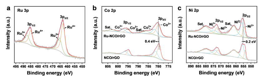 Công nghệ XPS có thể phân tích sâu thành phần nguyên tố, trạng thái hóa học và cấu trúc điện tử của bề mặt xúc tác. Khi bề mặt chất xúc tác được chiếu tia X, các electron của nguyên tử bề mặt bị kích thích. Bằng cách phát hiện năng lượng và số lượng của các quang điện tử này, chúng ta có thể xác định loại và hàm lượng của nguyên tố đó, cũng như môi trường hóa học nơi chứa nguyên tố đó. Ví dụ, khi nghiên cứu các chất xúc tác kim loại được hỗ trợ, XPS có thể xác định chính xác dạng kim loại trên bề mặt chất hỗ trợ, cho dù đó là nguyên tố kim loại hay oxit kim loại và sự thay đổi trạng thái oxy hóa của nó. Điều này rất quan trọng để hiểu được hoạt động và cơ chế khử hoạt tính của chất xúc tác. Như được hiển thị trong Hình 5, XPS đã được sử dụng để thể hiện thành phần và trạng thái hóa trị của các nguyên tố Ru, Co và Ni. Phổ mịn XPS của các nguyên tố cụ thể trong mẫu được sử dụng để xác định độ dịch chuyển dương/âm của năng lượng liên kết, cho thấy sự tồn tại của các tương tác điện tử.