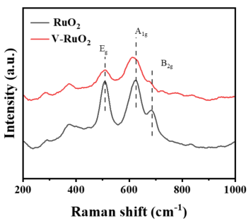 Như được hiển thị trong Hình 4, phổ Raman của V-RuO2 (RuO2 pha tạp V) phù hợp với phổ Raman của RuO2, không có các đỉnh duy nhất nào khác, ngoại trừ việc tạo ra V2O5. Doping V chuyển chế độ A1g của RuO2 sang số sóng thấp hơn, cho thấy rằng việc đưa V vào ảnh hưởng đáng kể đến cấu trúc mạng tinh thể và môi trường liên kết hóa học của nó (có thể dẫn đến chỗ khuyết oxy hoặc khuyết tật cục bộ), do đó làm thay đổi cấu trúc điện tử của nó; Sự dịch chuyển sang trái của đỉnh A1g phản ánh sự tương tác giữa các nguyên tử V và mạng RuO2, cho thấy pha tạp V điều chỉnh tính đối xứng cục bộ và đặc tính độ dài liên kết của RuO2.
